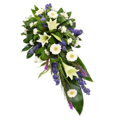 Gemaakt door onze lokale bloemist: dit druppelvormige rouwstuk in wit en paars met lelies, anjers en andere seizoensbloemen. Een mooi eerbetoon aan een dierbare. De afbeelding toont de medium variant (70 cm). Een rouwlint kan apart worden bijbesteld tijdens de checkout.
