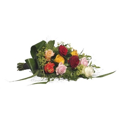 Een prachtig rouwboeket met rozen in verschillende kleuren en seizoensgroen. Met zorg gemaakt door de lokale bloemist. De afbeelding toont de "standaard" variant. Een rouwlint kan eventueel worden bijgevoegd tijdens de checkout.